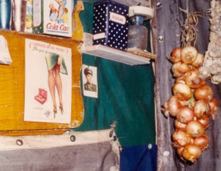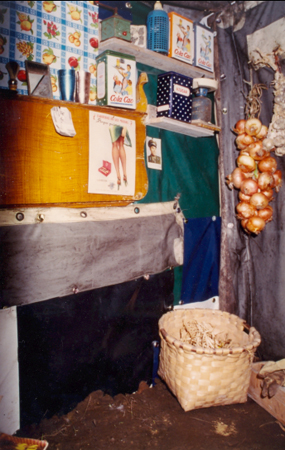 Un flash-back en el tiempo. Un espacio vivo exterior (huerto) se descontextualiza dentro de una galería de arte, sólo cambia la chabola con iconos remitidos al tiempo y recuerdos de la infancia, como búsqueda de un espacio espiritual.