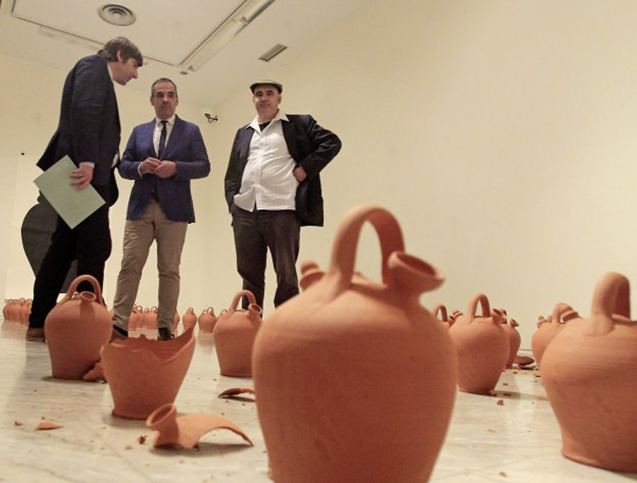 La primera de las tres instalaciones se titula Damocles, y consiste en una serie de botijos, alineados sobre el suelo, algunos de los cuales han sido destruidos. Un grabado en el que se representa un botijo ocupa una de los testeros. La instalación sugiere de inmediato no solo la fragilidad, sino también lo azaroso del destino que a cada uno nos ha tocado en suerte. Pues, al parecer, a unos les toca la china y a dros no. El artista afirma que la pieza remite a la inseguridad y precariedad a la que estamos arrojados en la vida moderna: despidos, paro, desahucios, falta de expectativas, crisis económicas, migraciones, etc. Pero lo cierto es que, lo que los individuos viven como una manifestación del azar, de su infortunio o de su mala estrella es para el sistema que lo controla el producto de un cálculo predeterminado.